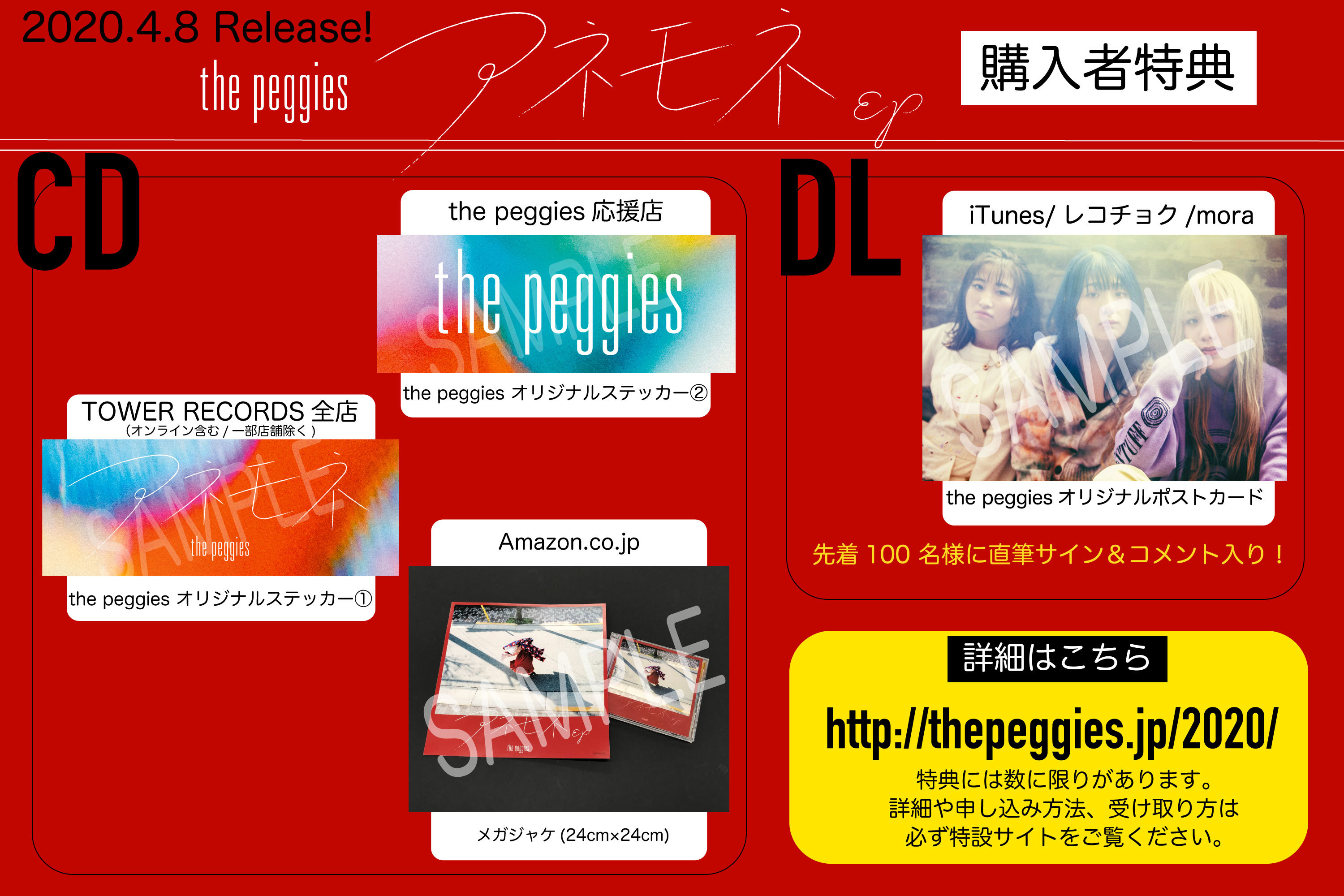 特典応募者には、撮り下ろし写真を使用したthe peggiesオリジナルポストカードが全員にプレゼント。更に先着100名には、the peggiesメンバーによる直筆サイン&コメント付きのポストカードとなる、ファンには嬉しいスペシャルな特典だ。応募方法は追って発表される。応援店、タワーレコード特典のステッカー、Amazon.jpでの購入特典「メガジャケ」の絵柄も発表されている。