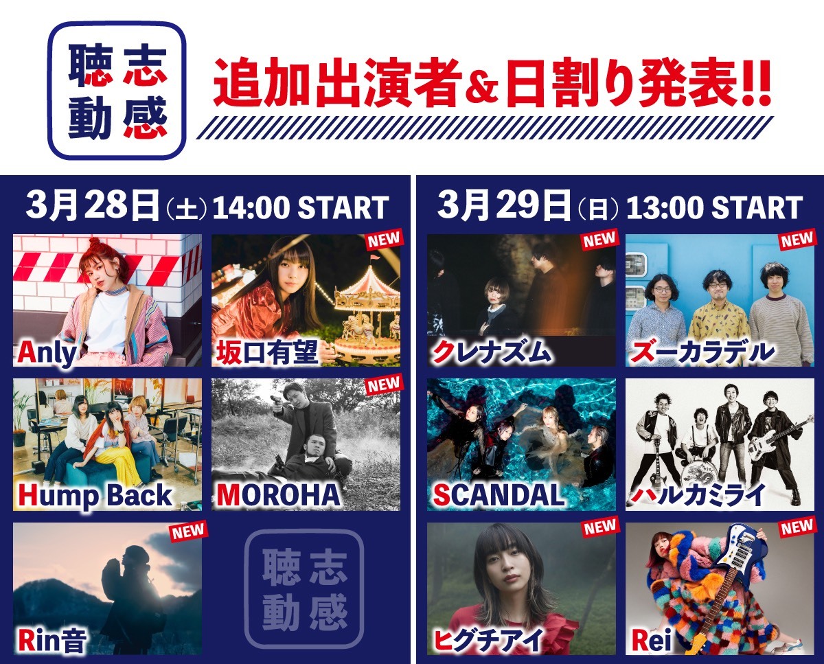 3月28日(土)、3月29日(日)の2日間、無観客スタジオ中継ライブイベント『聴志動感』の追加出演者と日割りが発表された。