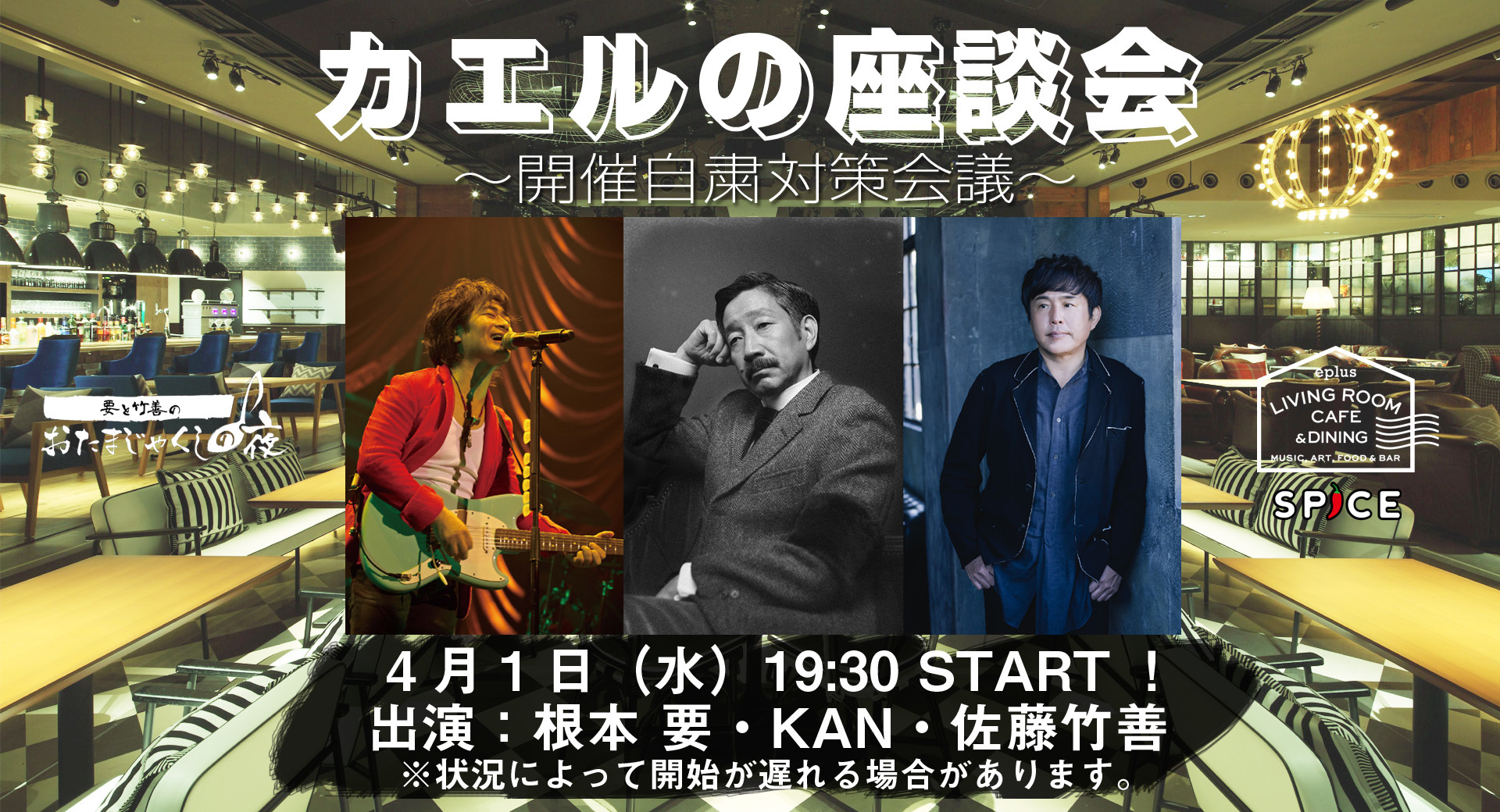 毎回、好評を博しているトークライブ『要と竹善のおたまじゃくしの夜』の公演延期に伴い、根本 要・KAN・佐藤竹善によるスペシャル番組『カエルの座談会 ~開催自粛対策会議~』が4月1日(水)19時30分から【SPICE LIVE CHANNEL】にて配信されることが決定した。