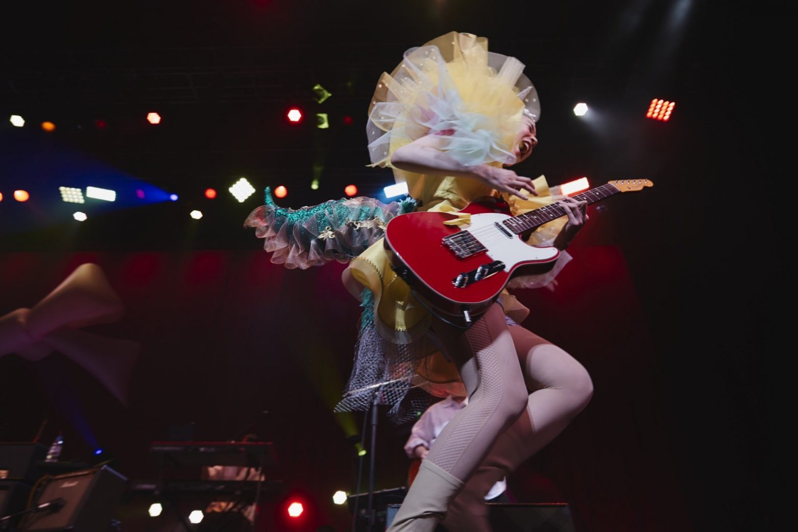 2組目は、のんがリスペクトしてやまないGO!GO!7188のユウがメンバーのバンド、チリヌルヲワカ。場内暗転しSEが流れる中、メンバーが登場。真っ白なコスチュームに身を包んだユウの青いテレ・キャスターがかき鳴らされ、ライブがスタート。3ピースというミニマムな編成ながら、途轍もなくデカい音を弾き出し、間髪入れず次の「マシーン」を叩き込む。3曲めの「極楽浄土」では、ベース・リフから始まり、ユウのカッティングが被さる。ゾクゾクするほどカッコいいイントロだ。