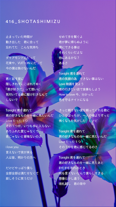 「416」は、清水翔太にとって約8か月ぶりとなる新曲リリース。既に意味深なタイトルや「ⅣⅠⅥ」とシンメトリーで表現されたジャケット写真などが公開されているが、今回の歌詞先行公開でさらに「416」への期待感は高まりそうだ。