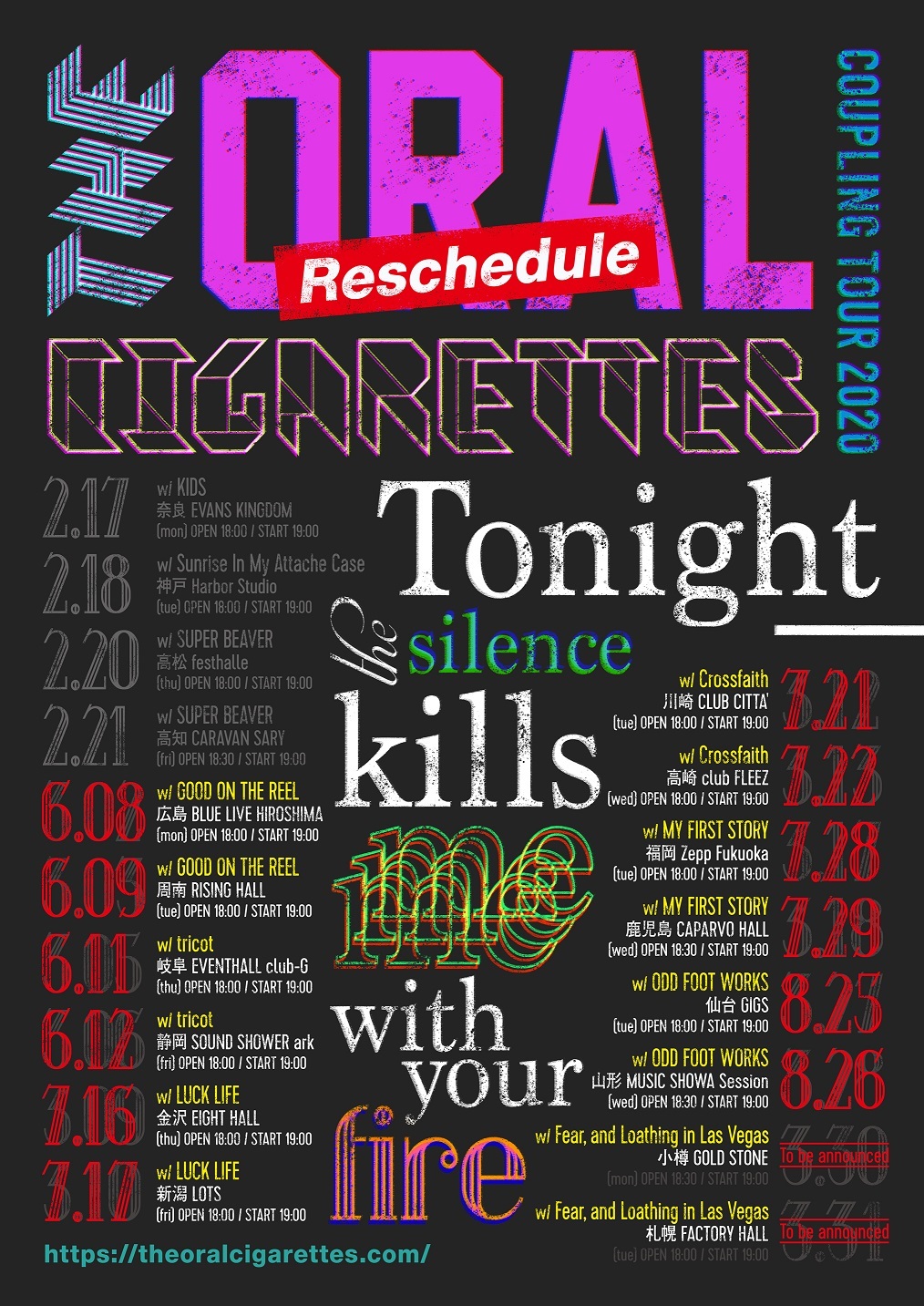 4月29日(水)にニューアルバム『SUCK MY WORLD』をリリースするTHE ORAL CIGARETTESが、先日新型コロナウイルスの感染拡大の状況により開催見合わせとなった、COUPLING TOUR『Tonight the silence kills me with your fire』の振替公演を発表した。