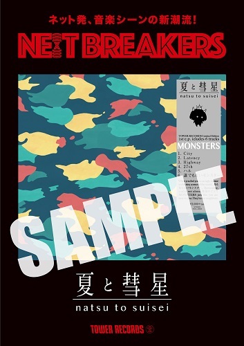 『NE(X)T BREAKERS / ネットブレイカーズ』はインターネット上で話題になっている次世代アーティストのブレイクを後押しする企画。その第10弾アーティストとして、5月13日に1st EP『MONSTERS』をリリースする夏と彗星が決定した。タワーレコードでは夏と彗星を片表紙に起用した小冊子を配布。このほかにも、5月12日より店頭でのコラボレーションポスターの掲出や特別レシート配布、新譜購入者へのオリジナル特典のプレゼントなどさまざまな施策が行われる。