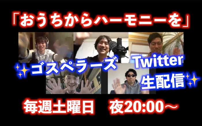 配信タイトルは「おうちからハーモニーを」となり、土曜日の夜20時〜毎週配信される。現在、ゴスペラーズからのメッセージ動画が公開中だ。