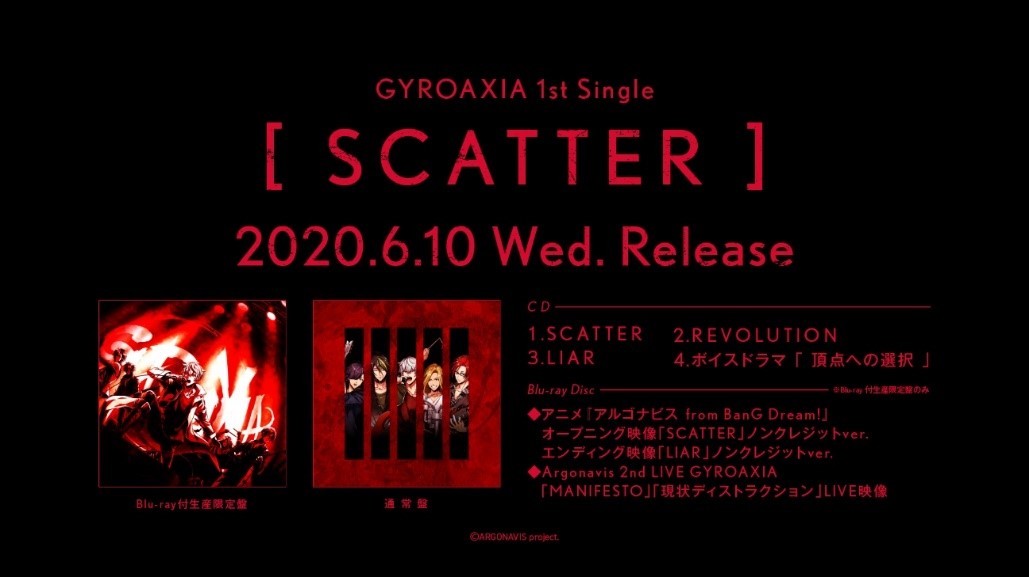 さらに、『Argonavis 2nd LIVE』で衝撃デビューを遂げた GYROAXIA の 1st シングル「SCATTER」が、6月10日(水)に発売決定した。
