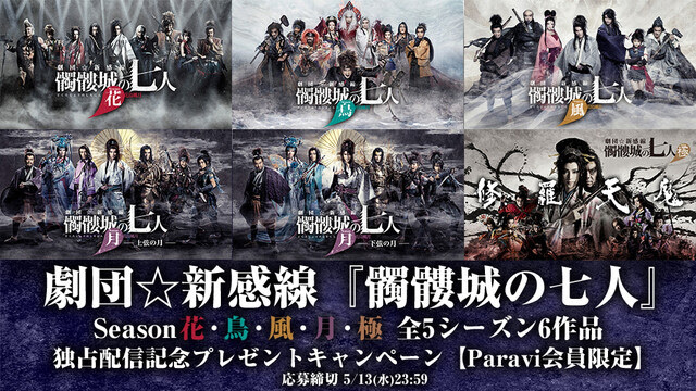 2020年4月13日(月)12:00 ~5月13日(水)23:59の期間、動画配信サービス「Paravi(パラビ)」では、IHIステージアラウンド東京のグランドオープニングを飾り、累計55万人を動員した劇団☆新感線『髑髏城の七人』Season花・鳥・風・月・極 全5シーズン6作品の独占配信を記念して、抽選で合計60名に当たる【Paravi会員限定】プレゼントキャンペーンを実施する。
