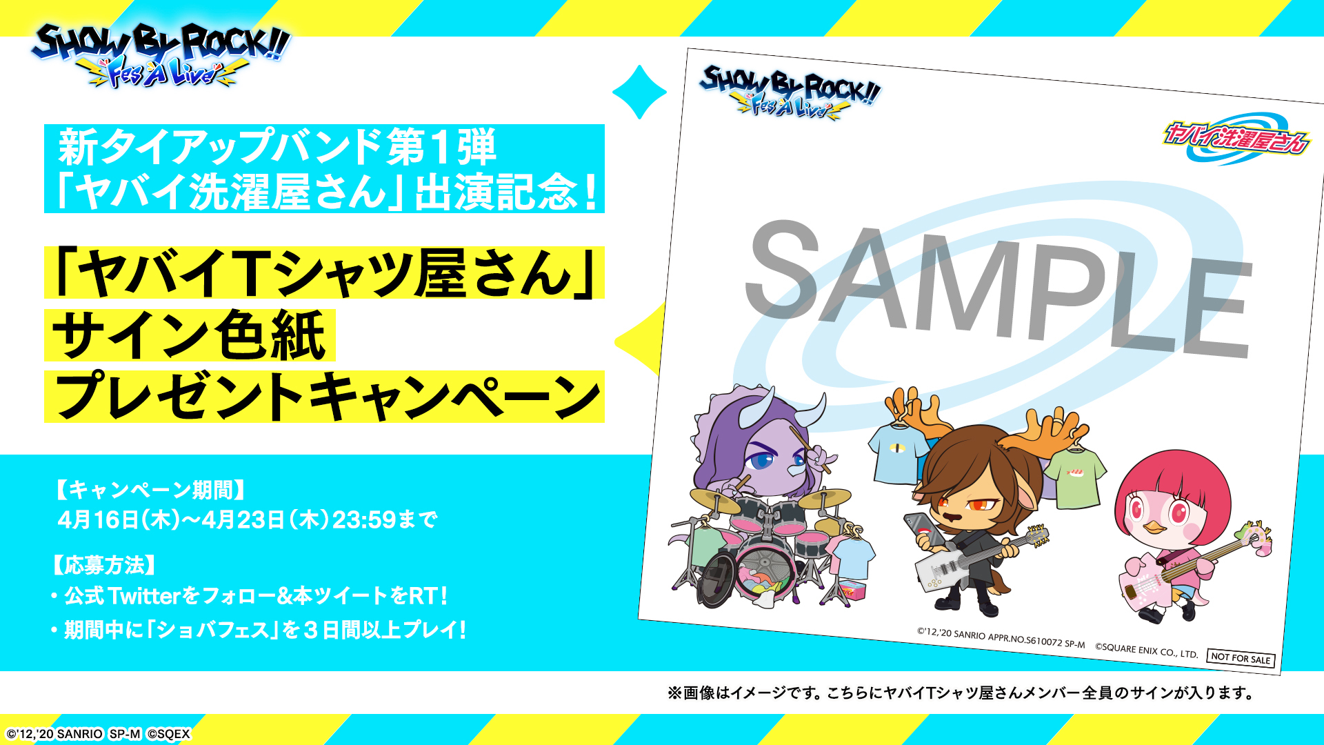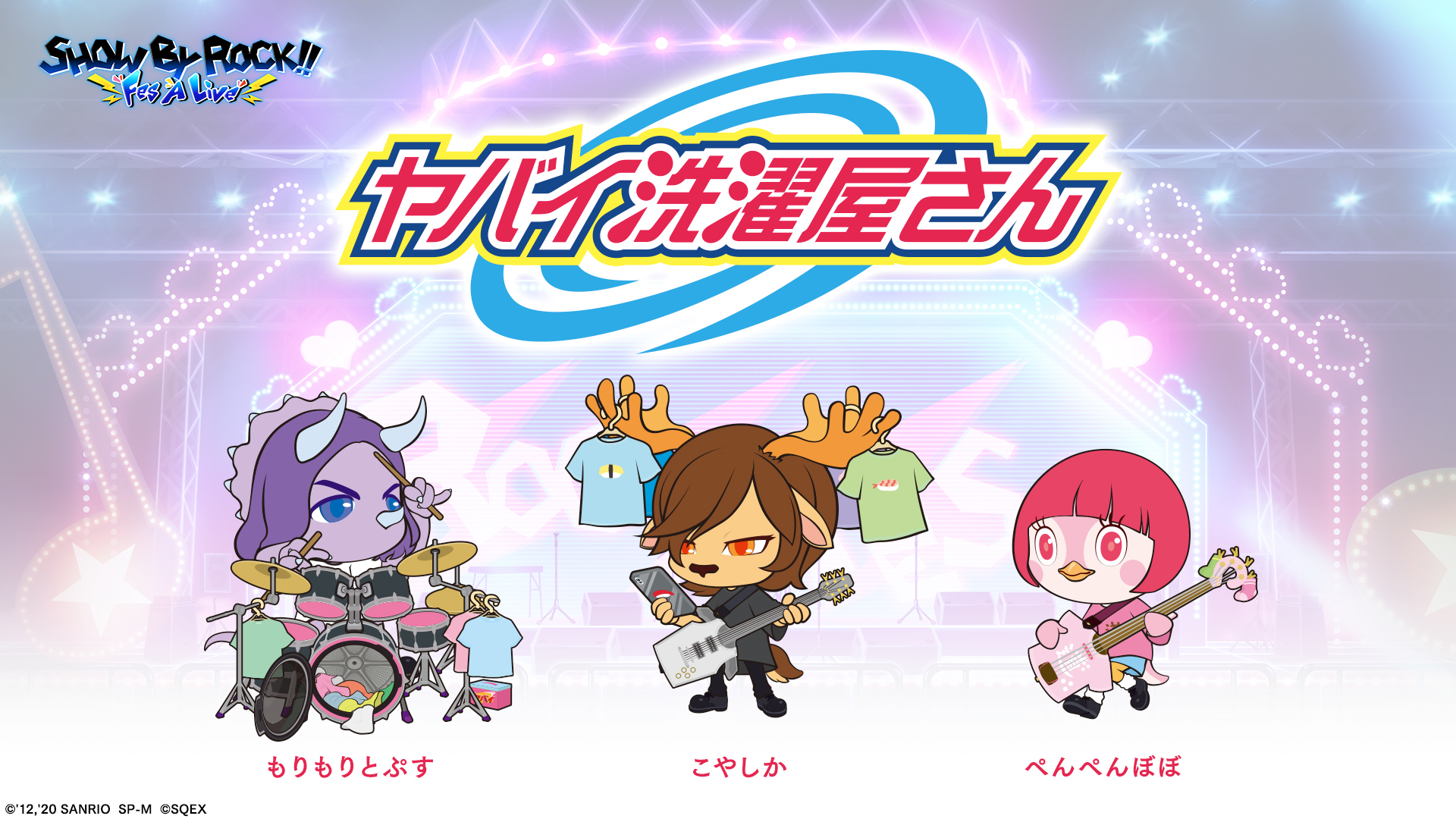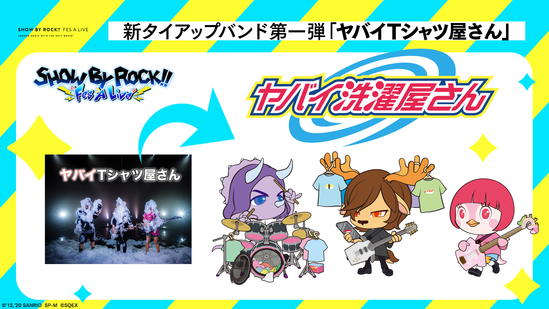 スマートフォン向けリズムゲーム『SHOW BY ROCK!! Fes A Live』(以下、ショバフェス)で、新タイアップバンド第一弾「ヤバイ T シャツ屋さん(通称:ヤバ T)」をイメージした個性的なキャラクターバンド、「ヤバイ洗濯屋さん」が新たに参戦、イメージビジュアルも発表された。