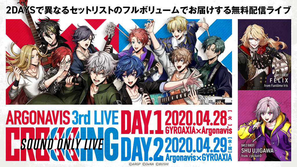 両日ともArgonavisとGYROAXIAが出演するが、ゲストとしてDAY.1 には Fantôme Iris より Vo.FELIX(CV.ランズベリー・アーサー)、DAY.2 にはεpsilonΦ より Vo.宇治川紫夕(CV.榊原優希)の出演が決定している。