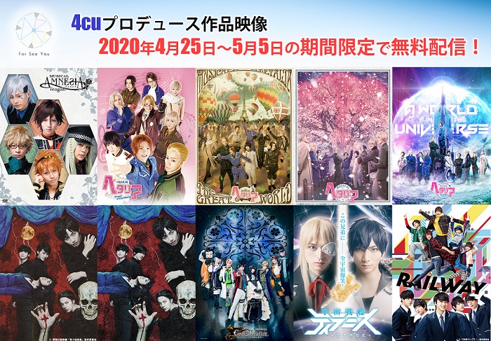 2020年4月25日(土)~5月5日(火)の期間中、4cu企画・プロデュースの舞台・ライブ映像が期間限定で無料配信されることが決定した。