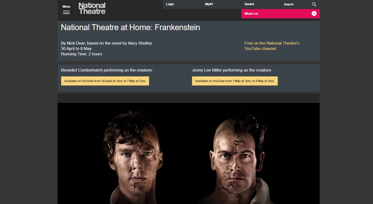 4月30日(木)(現地時間)から配信されるのは『フランケンシュタイン』。メアリー・シェリーの小説を原作にアカデミー賞監督ダニー・ボイルが演出した2011年上演の作品。本作品で、主演の2人ベネディクト・カンバーバッチとジョニー・リー・ミラーがローレンス・オリヴィエ賞主演男優賞を同時受賞した傑作舞台だ。今回の配信でもベネディクト・カンバーバッチとジョニー・リー・ミラーの2バージョンが配信され、それぞれ配信開始および終了が1日異なるので注意したい。