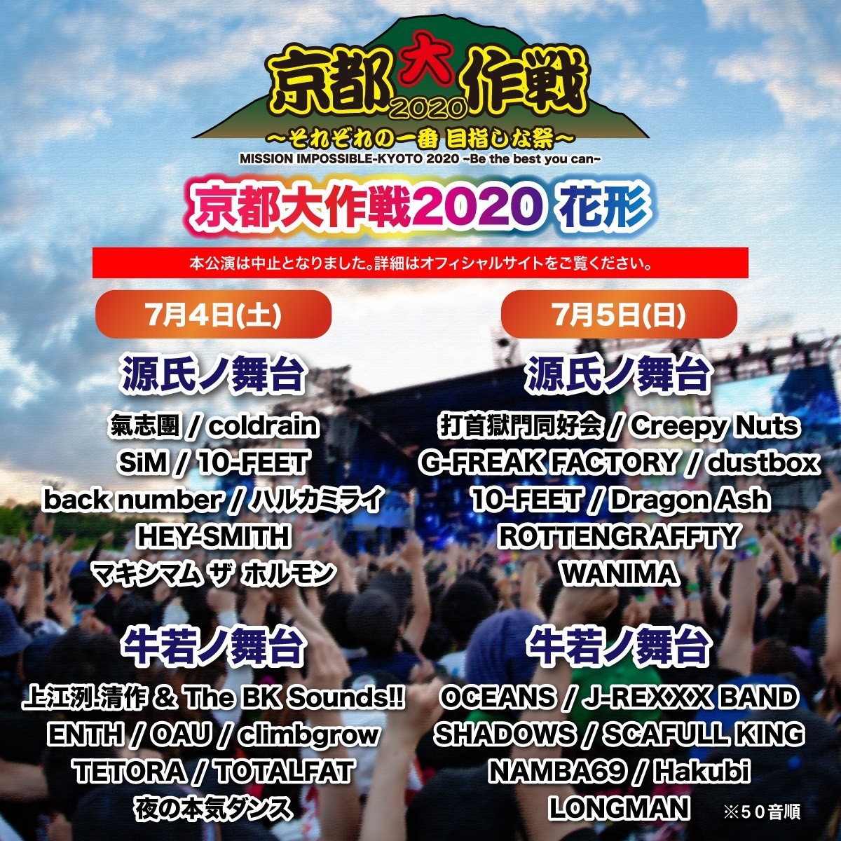 10-FEETが、7月4日(土)、5日(日)に京都府立山城総合運動公園 太陽が丘特設野外ステージにて開催予定の『京都大作戦2020〜それぞれの一番 目指しな祭〜』を、新型コロナウイルスの感染拡大を受けて中止とすることを発表した。