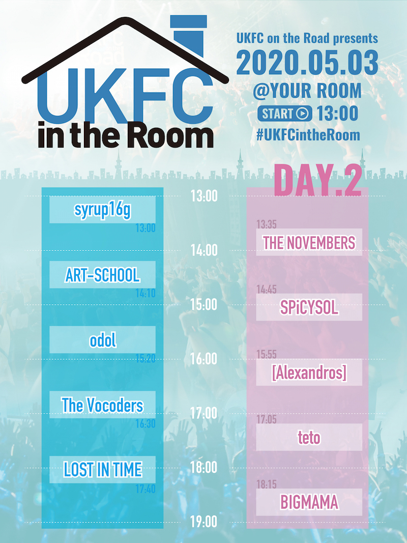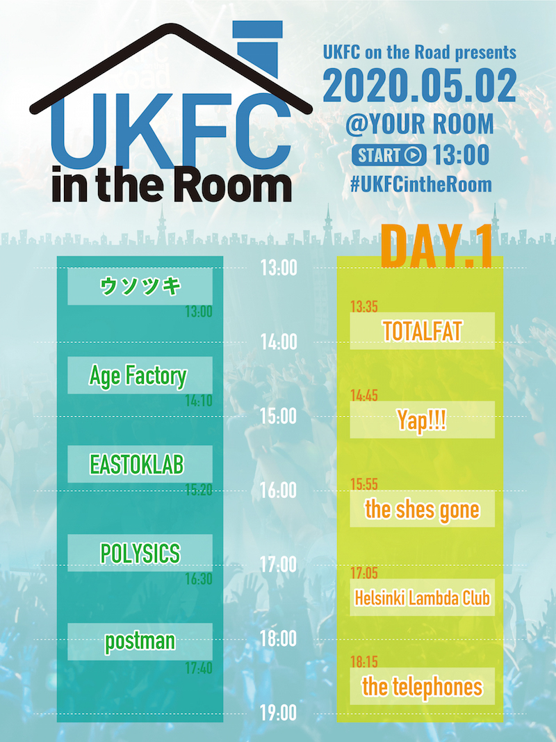 同企画は、これまで同社が毎年夏に開催するライブ『UKFC on the Road』の出演アーティストや所属アーティスト全20組が、「今リスナーに届けたい楽曲」をテーマに選曲した“仮想セットリスト”を『UKFC in the Room』のオリジナルプレイリストとして、タイムテーブルに沿ってリアルタイムで公開していくというもので、Apple Music、Spotify、AWA、LINE MUSICにて公開予定となっている。