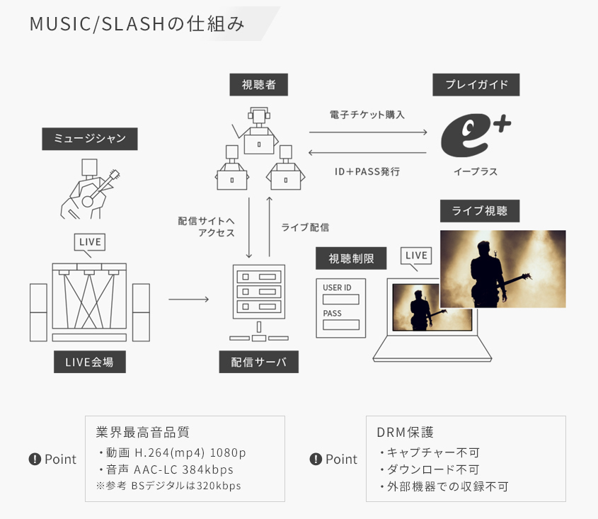 また、株式会社イープラスと業務提携を行い、今後はイープラスのチケット販売サイトにて『MUSIC/SLASH』が提供する映像配信イベントの有料視聴チケットの販売を行う。配信される動画には視聴制限が設けられており、イープラスにてチケットを購入したユーザーのみが視聴可能となる。さらに、コンテンツの違法コピー、違法アップロードなどによるアーティストの権利を侵害する行為から権利者を守る世界最高レベルのDRM機能(デジタル著作権管理)を搭載している。