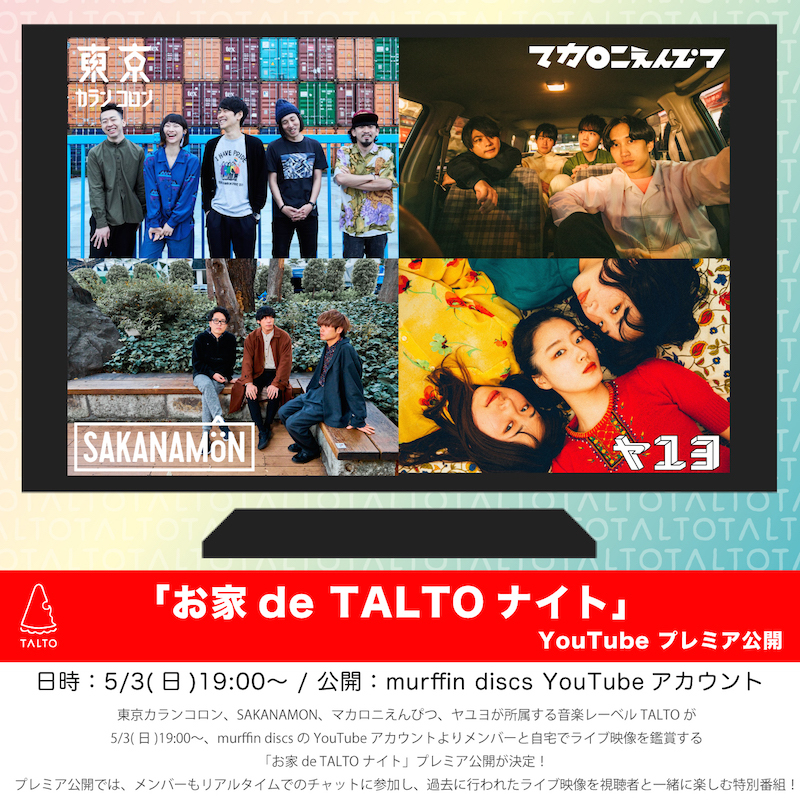 音楽レーベルTALTOが5月3日(日)19:00〜murffin discsのYouTubeアカウントにて、東京カランコロン、SAKANAMON、マカロニえんぴつ、ヤユヨのライブ映像を鑑賞できる『お家de TALTOナイト』をプレミア公開する。