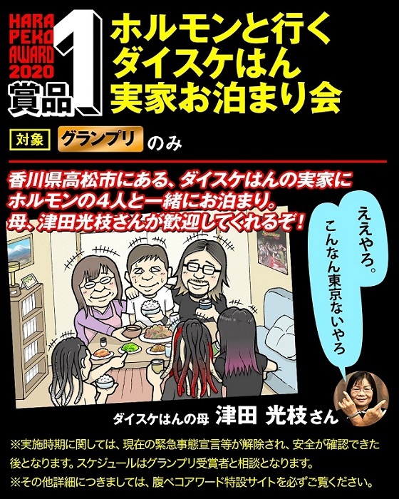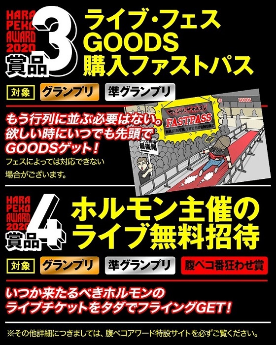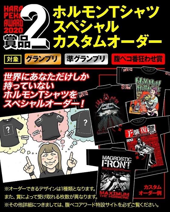 グランプリには「ホルモン主催ライブの無料招待権」「物販ファストパス」をはじめとした超豪華賞品が用意されている他、準グランプリ、クオリティの低い作品でもホルモン愛が強くメンバーがグッときた作品に贈られる「腹ペコ番狂わせ」枠も選出。コンテスト結果の発表はメンバーによる審査を経て、今後ホルモン公式YouTubeで発表される予定。