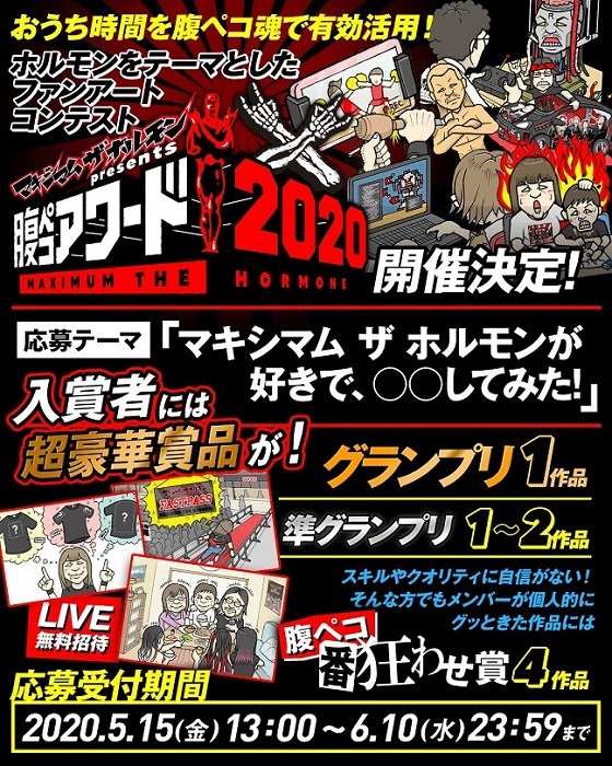 マキシマム ザ ホルモンが自身をテーマとし、アート作品を募集するファンアートコンテスト『腹ペコアワード2020』開催を発表した。ホルモン愛があるものならばプロアマはもちろん、どんなジャンルのどんな創作作品でも問わないコンテストとのことで、国内外問わず全世界から応募を受けつける。