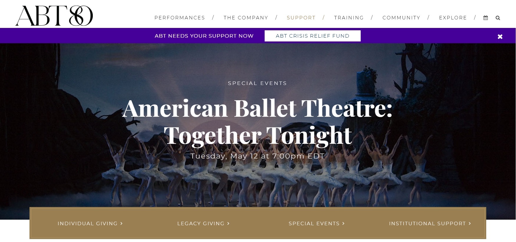 『ABT:Together Tonight』は、リモートによってつくられた新しいパフォーマンスやABTの貴重な過去映像によって構成されるガラ形式のオンラインイベント。ABTのダンサーやオーケストラのほかスペシャルゲストによるパフォーマンスも予定されている。