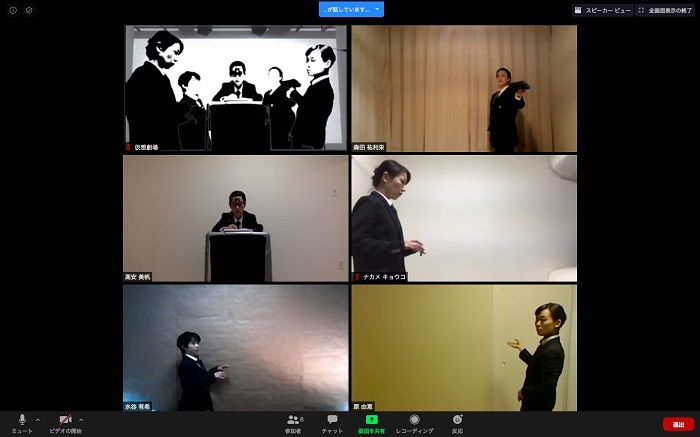 当初本公演は、大阪・ウイングフィールドで上演予定だったが、新型コロナウイルス感染拡大防止のため、劇場での上演を断念。なんとか上演したいという想いで、俳優、スタッフがさまざまな方法を試した結果、インターネット上に稽古場を設けて、俳優、スタッフとリモート・クリエイションを重ね、インターネット上につくった「仮想劇場」で上演することになった。