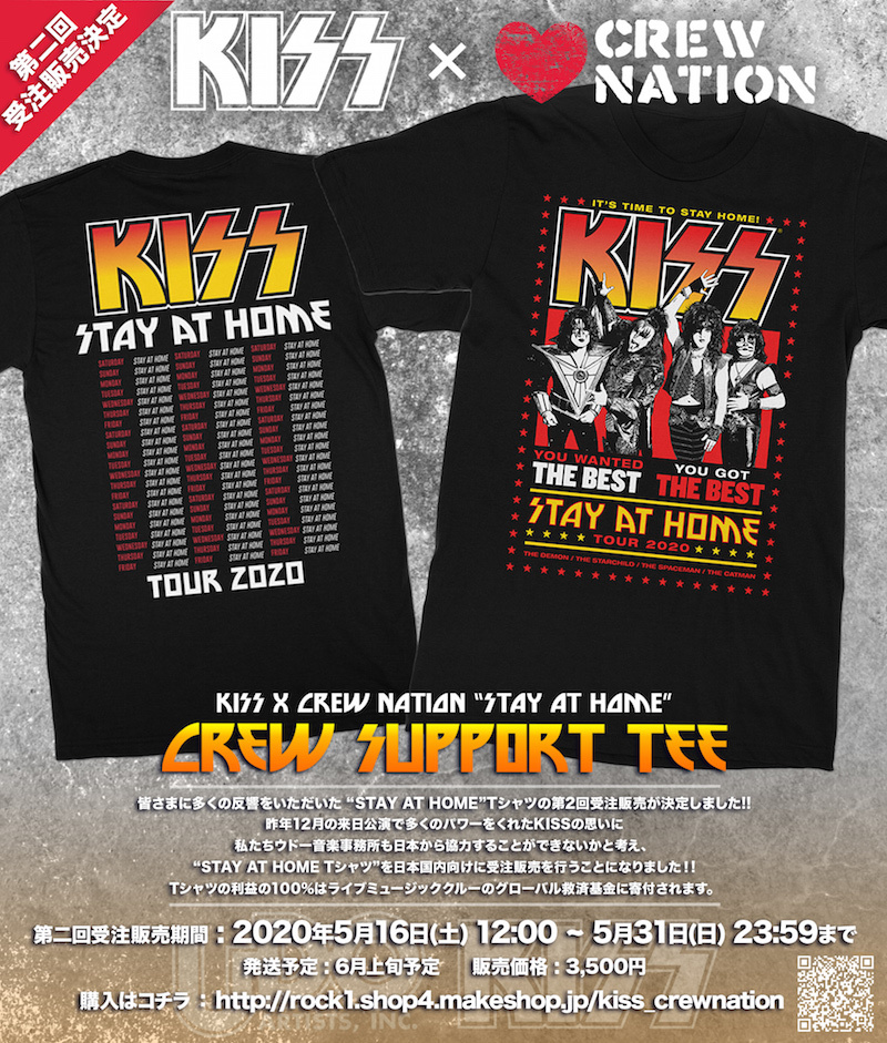 KISSが、CREW NATIONとコラボした『KISS x CREW NATION “STAY AT HOME” Tシャツ』が販売される。