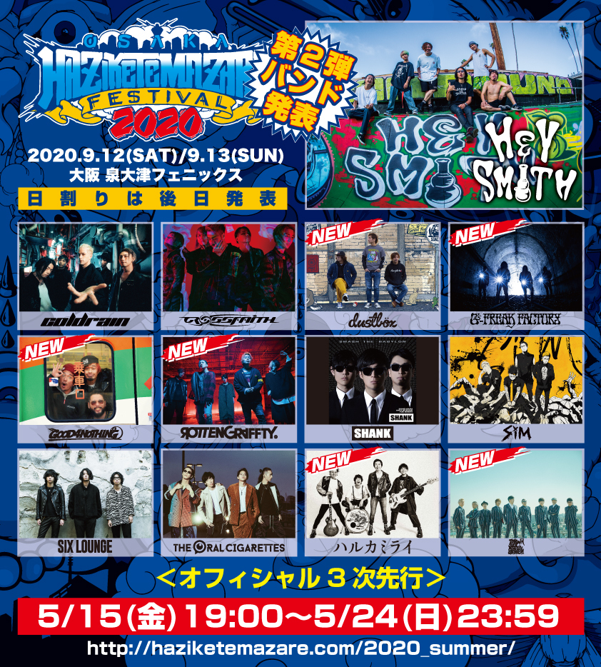 9月12日(土)、13日(日)の2日間、大阪・泉大津フェニックスにて開催される『HEY-SMITH Presents OSAKA HAZIKETEMAZARE FESTIVAL 2020』の第2弾出演アーティストが発表された。