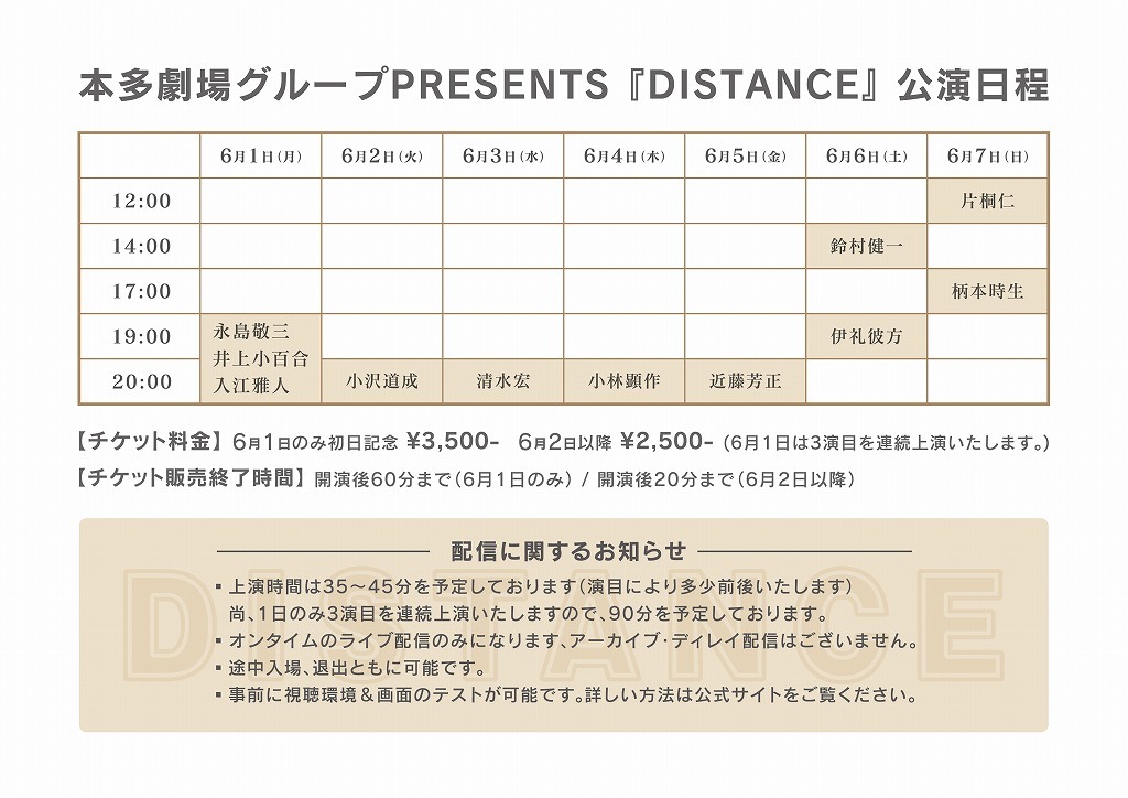 2020年6月1日(月)に営業を再開することを発表した本多劇場グループが、1日(月)~7(日)の1週間開催する本多劇場グループ PRESENTS「DISTANCE」。出演キャストに片桐仁、鈴村健一が新たに加わることが発表された。また、タイムテーブルも解禁となった。