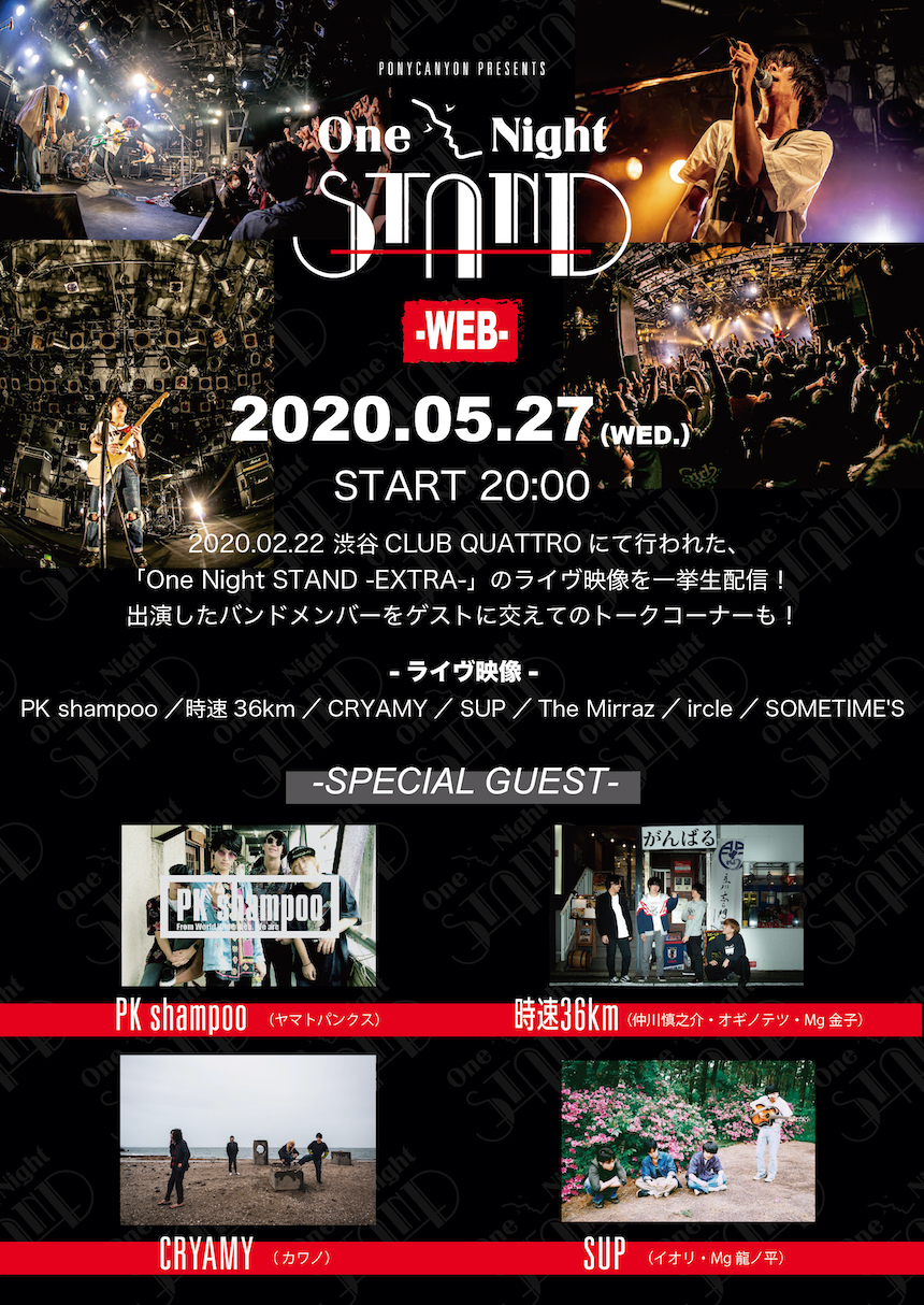 今回、WEB版として公開されるのは、2月22日(土)渋谷CLUB QUATTROにて開催された『One Night STAND -EXTRA-』のライヴ映像。出演したPK shampoo、時速36km、CRYAMY、SUP、The Mirraz、ircle、SOMETIME'Sの全7組ライヴ映像がダイジェスト編集されたものが、アーカイブ配信なしの一夜限りで公開される。