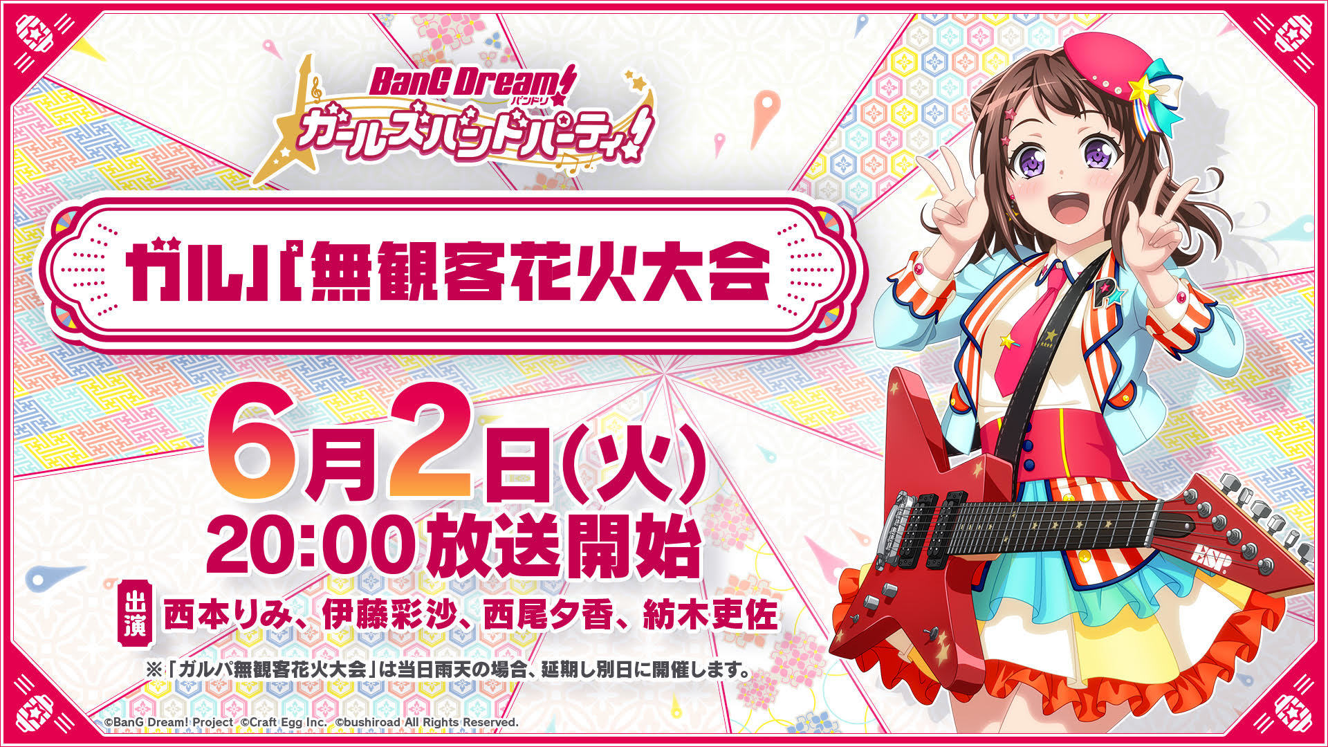 キャラクターとライブがリンクする次世代ガールズバンドプロジェクトで、アニメ、ゲーム、リアルライブなどのメディアミックスを展開している「BanG Dream!(バンドリ!)」では、6月2日(火)20:00 から「ガルパ無観客花火大会」を実施する、と発表した。