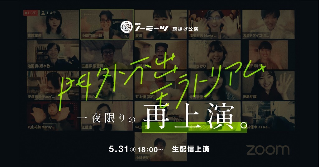 2020年5月31日(日)18:00より、フルリモートで創作・上演する「劇団ノーミーツ」の旗揚げ公演『門外不出モラトリアム』が一夜限りの再演を行うことを決定した。