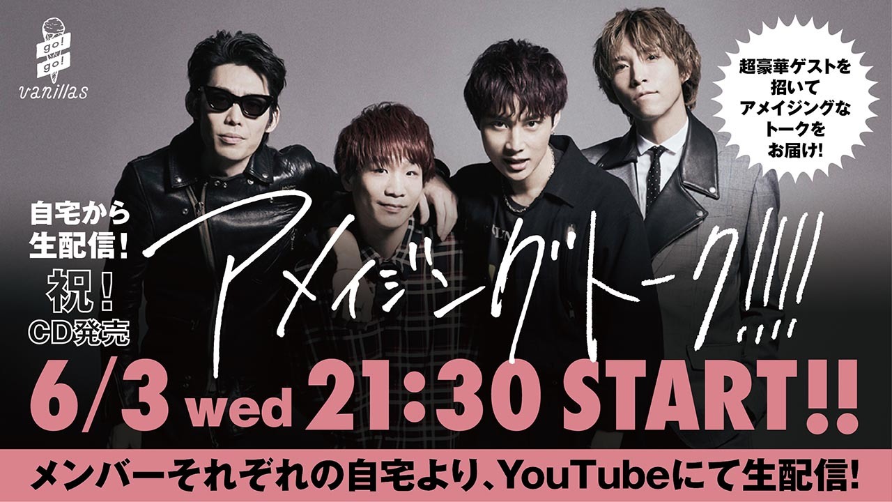 go!go!vanillasが、ニューシングル「アメイジングレース」の発売日である6月3日(水)21:30よりバンドのオフィシャルYouTubeチャンネルにて『祝!CD発売アメイジングトーク!!!!』を生配信することを発表した。