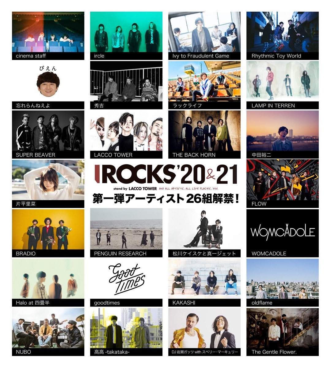 今回、出演が決定したアーティストは、主催者であるLACCO TOWERの他、『I ROCKS 2020』への出演を予定していたアーティストから、ircle 、Ivy to Fraudulent Game、WOMCADOLE、oldflame、KAKASHI、、The Gentle Flower.、SUPER BEAVER、高高-takataka-、DJ岩 瀬ガッツ with スベリー・マーキュリー、中田裕二、NUBO、THE BACK HORN、Halo at 四畳半、FLOW、BRADIO、秀吉、PENGUIN RESEARCH、松川ケイスケと真一ジェット、ラックライフ、LAMP IN TERREN、Rhythmic Toy World、忘れらんねえよの計26組。また、本公演より会場をメンバーの “故郷” にある群馬県 伊勢崎市文化会館へ移し、過去最大規模の公演となる予定とのこと。