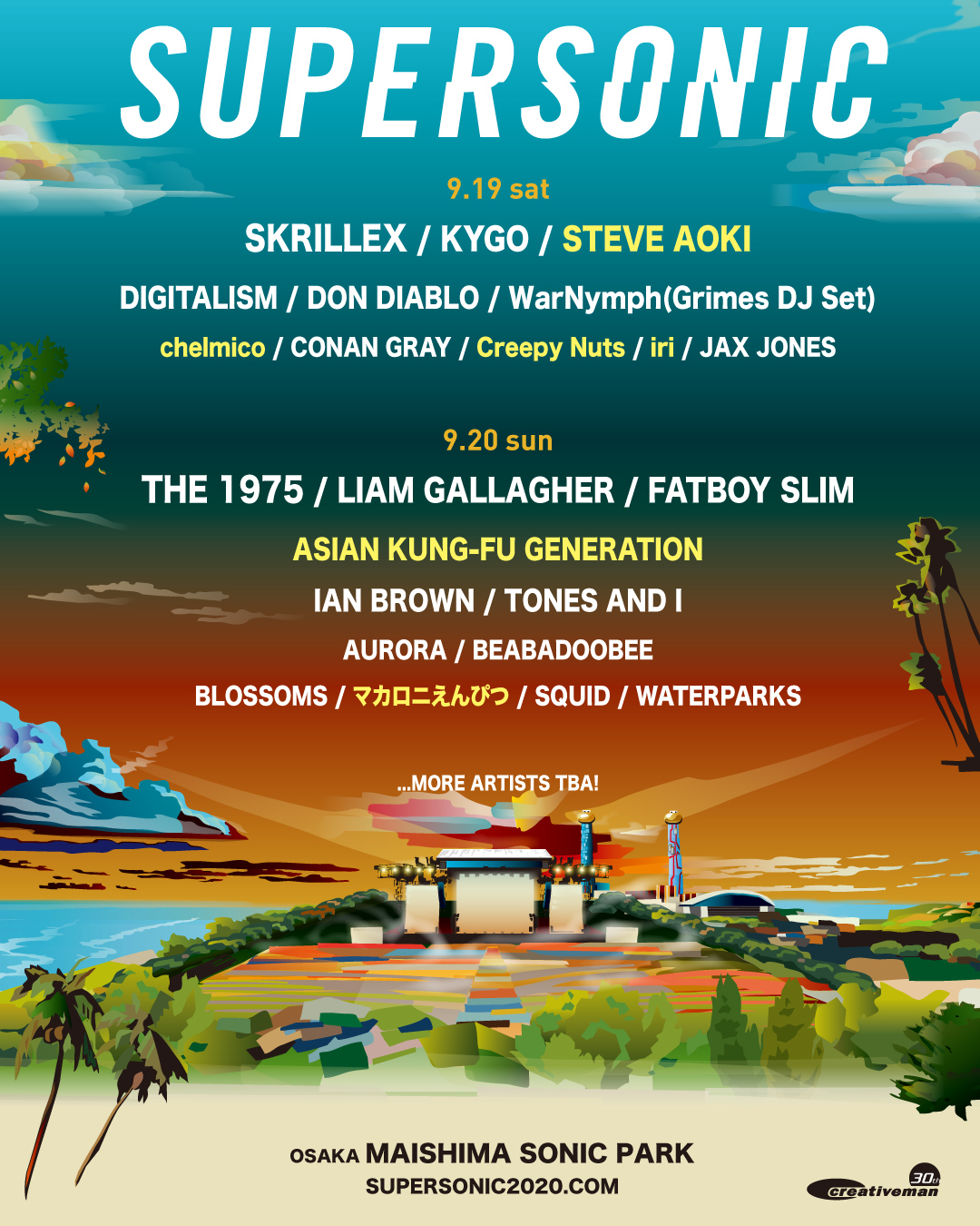 『SUPERSONIC』はヘッドライナーとして、THE1975、SKRILLEX、POST MALONE(東京のみ)を迎えることがアナウンスされており、先日、第二弾アーティストとしてASIAN KUNG-FU GENERATION、マカロニえんぴつ、CLEAN BANDIT DJ SET(東京のみ)、BiSH(東京のみ)、STEVE AOKI、Creepy Nuts、iri、きゃりーぱみゅぱみゅ、ちゃんみな(東京のみ)、BLACK EYED PEAS、Nulbarich、chelmico、GHOSTEMANE、女王蜂が発表された。全ラインナップについては『SUPERSONIC』のHPをチェックしよう。
