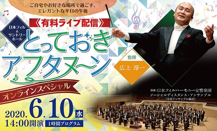 2020年6月10日(水)14:00より、日本フィルハーモニー交響楽団とサントリーホールの共催で、イープラス・Streaming+にてオンラインコンサート『とっておき アフタヌーン オンラインスペシャル』を開催することが決定した。