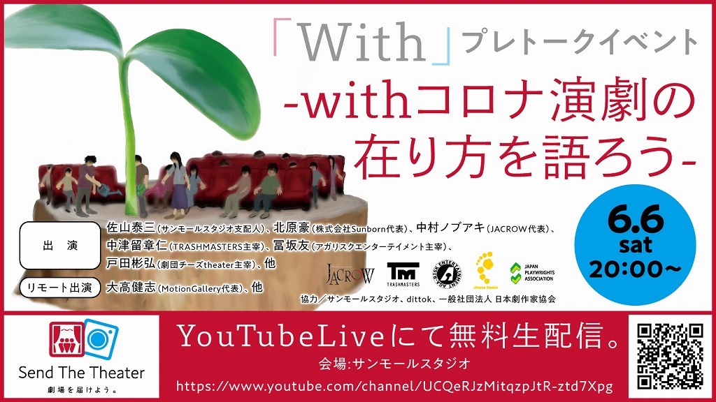 同プロジェクトの一環として、6日(土)夜8時より劇場・配信・作り手のそれぞれの立場から with コロナ時代の新しい演劇を語るプレトークイベントを本公演として開催。そして、6月20日(土)、21日(日)には、新宿・サンモールスタジオにて、チーズtheater・JACROW・TRASHMASTERS・アガリスクエンターテイメントの4団体によるオムニバス公演をそれぞれオンライン生配信にて上演する。