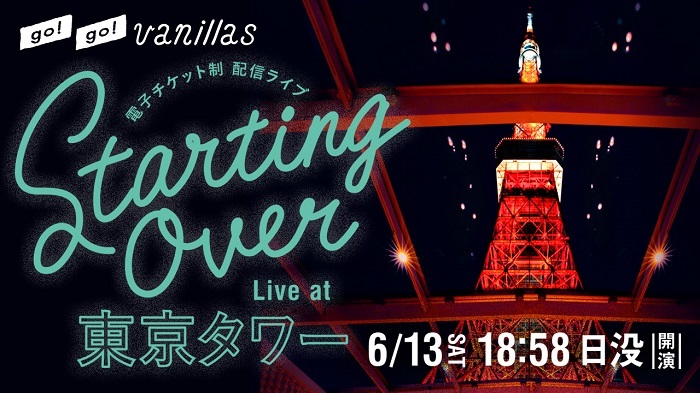 go!go!vanillasが、2020年6月13日(土)18:58 [日没] より、メンバー4人では初となる電子チケット制 配信ライブ『STARTING OVER – Live at 東京タワー』を開催すると発表した。