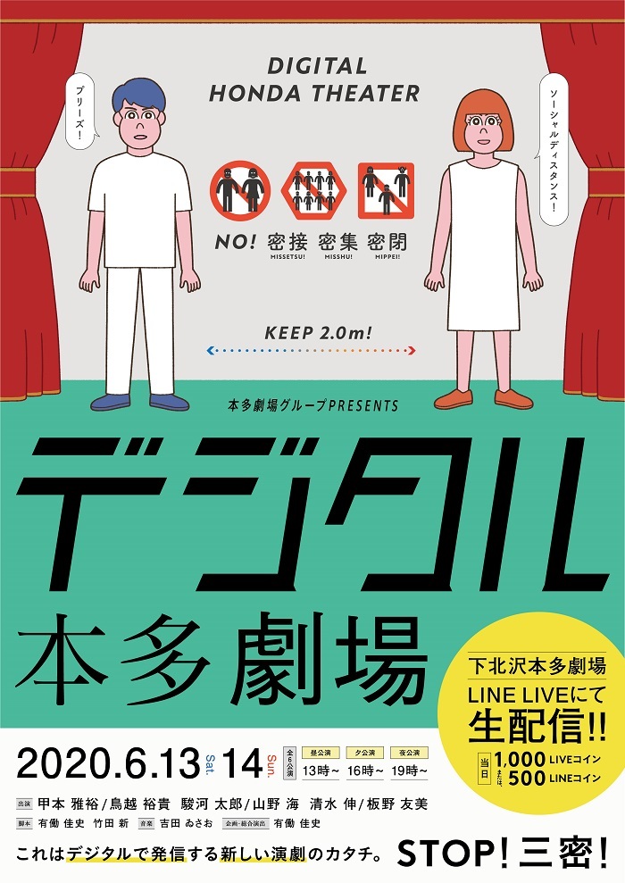 2020年6月13日(土)・14日(日)に、ライブ配信サービスLINE LIVEにて、三密回避シチュエーションオムニバス舞台「『デジタル本多劇場』~近づきたくても近づけない人々の悲喜交々~」が配信されることが決定した。