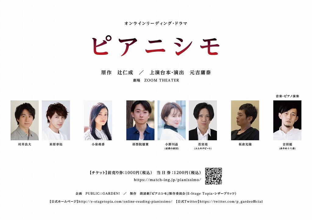 2020年6月13日(土)23:00より、ZOOM THEATERにて開催される、PUBLIC∴GARDEN! オンラインリーディング公演 vol.2『ピアニシモ』に村井良大、小泉萌香、若宮亮が参加することが発表された。
