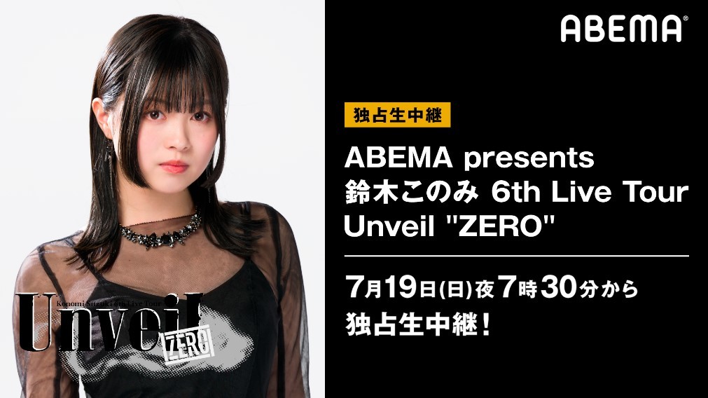 テレビ&ビデオエンターテインメント「ABEMA(アベマ)」は、6月中旬にリリースされる有料オンラインライブの新機能「PayPerView(ペイパービュー)」で、鈴木このみのオンライン無観客ライブ『ABEMA presents 鈴木このみ 6th Live Tour ~Unveil ”ZERO”~』公演を、2020年7月19日(日)夜7時30分より独占生配信すると発表した。