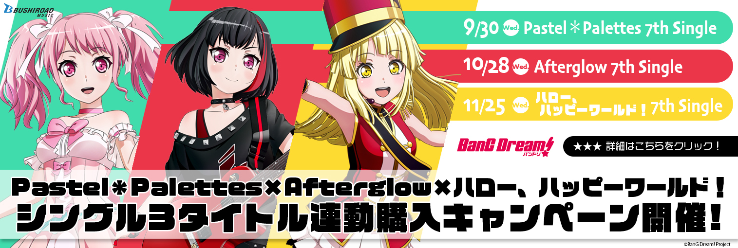 発売は、Pastel*Palettesが9月30日、Afterglowが10月28日、ハロー、ハッピーワールド!が11月25を予定。ジャケ写や同梱特典、法人別の特典などは続報を待とう。