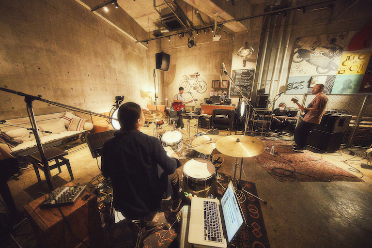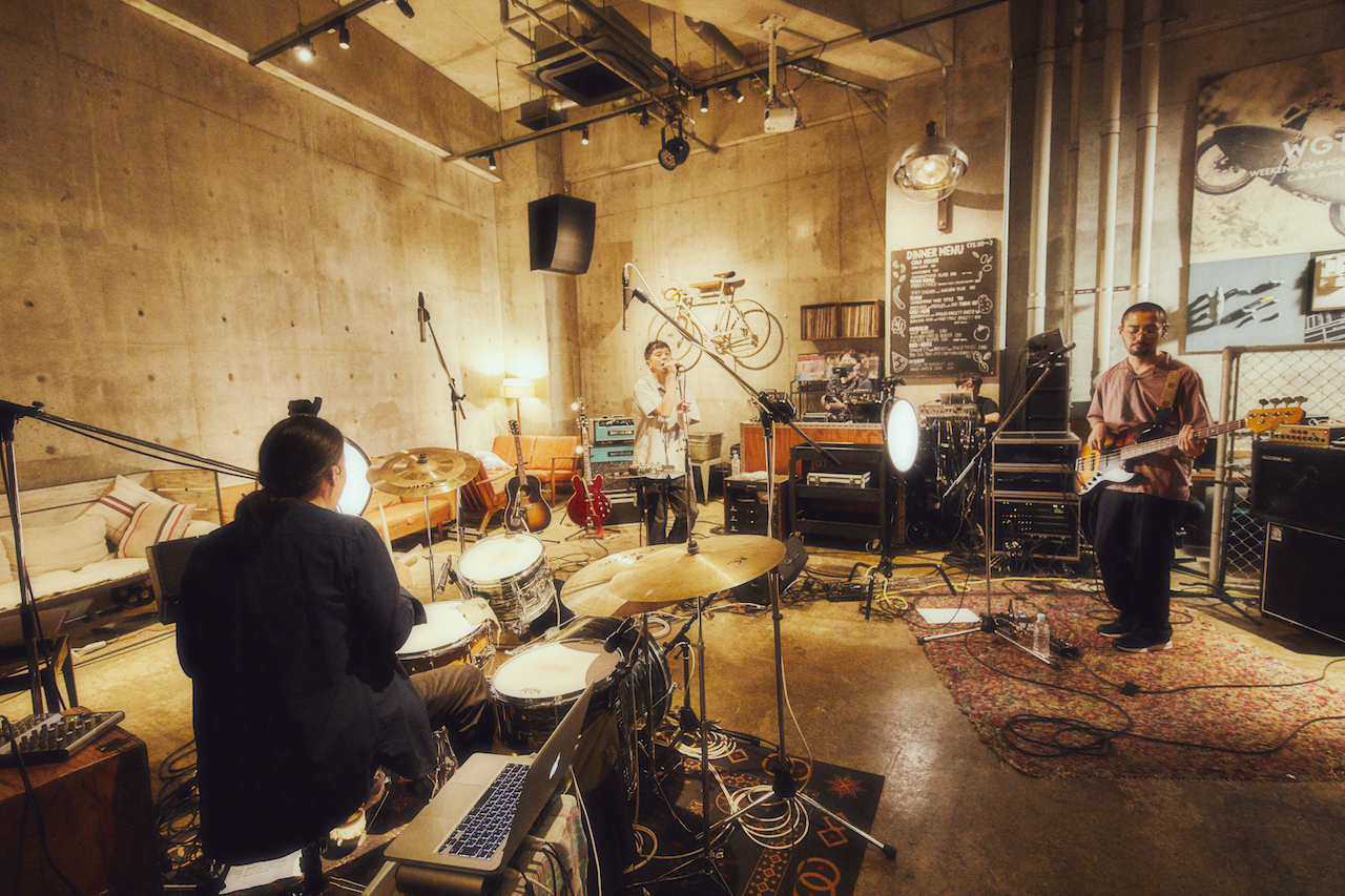 しかしここまで観て、すごく驚いた。「ライブを観ている気がしない」のだ。や、すごくいい意味で! ……というのも、ライブドキュメンタリーを観ている感覚と言う方が正しい気がしたからだ。今回のライブは先述した通りライブハウスではなく、東京・代官山のWeekend Grage Tokyoというカフェで行われたということがひとつ。そして定点カメラではなく、何台ものカメラを駆使してメンバー3人それぞれの表情や演奏中の手元、全員の引きの姿など多彩なカメラワークによって、しっかりとした映像作品として成り立っていることがもうひとつの理由としてある。ライブ配信=ライブハウスでの演奏を定点カメラで撮影して配信するものとばかり思っていたけれど(この日のライブを録画して翌日から配信するのだと思っていた)、そうか、こういうやり方もあるんだよなと膝を打った。