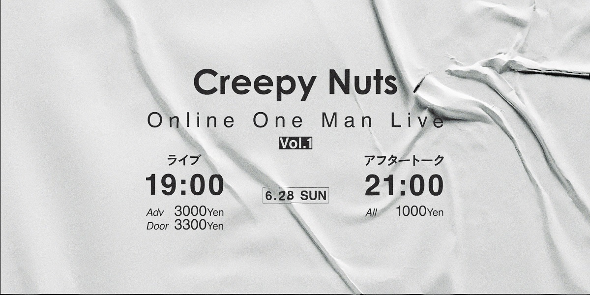 Creepy Nutsが、初の無観客有料配信ライブ&アフタートークイベント『Creepy Nuts Online One Man Live Vol.1』を6月28日(日)行うことが発表された。