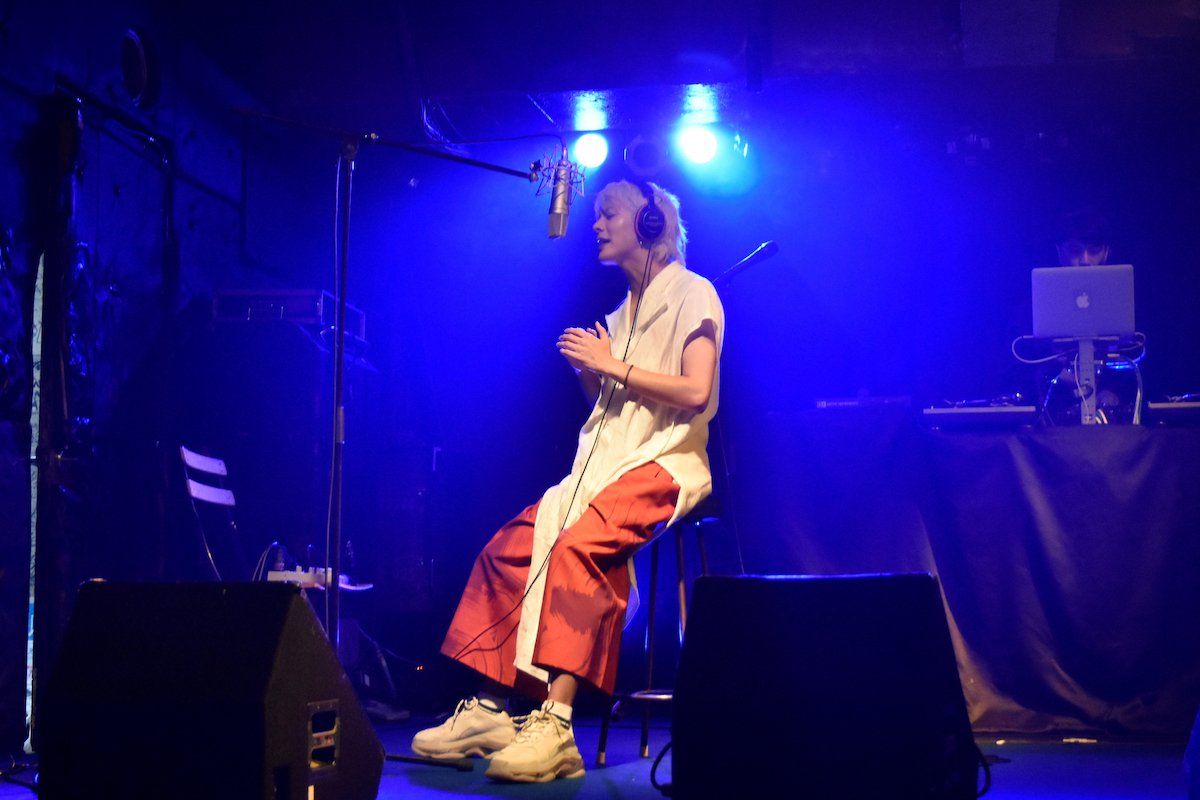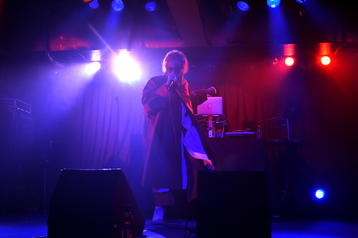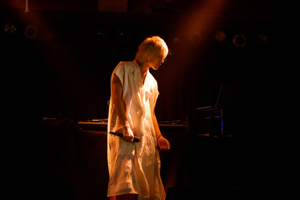 ライブは定刻にスタート。スモークの中、青白く浮かび上がったステージと明滅するストロボの向こう、Takuya IDEとDJ HIRORONが表れる。まずはIDEがCVを始め楽曲提供やラップにて参加しているスマホアプリ『ブラックスター 〜Theater Starless』から「雷神」のイントロが登場SE代わりに独特の緊張感を場内に漲らせていく。それを突き破るように現れた「雷神」では、バウンス性溢れるBPM高めなブロークンビーツが起爆。トリッキーで攻め攻めのIDEのラップと共にリスナーも並走を始める。オーバーサイズのオレンジ色のコート姿にブロンドの髪という出で立ちのIDE。つけていたサングラスを外し、続いては攻撃性と社会性の高いラップの数々で我々に詰問してくる。「ライブノチケットヲタテマツル」でのレスポンスでは視聴者も一斉に「タテマツル」とチャットにて応答。ケロらせたモチーフフレーズのロングトーンも印象深い「ズットマッテル」や「Dante」のワンフレーズが次々と同曲にブレンドされ、トリッキーな波状攻撃が始まる。