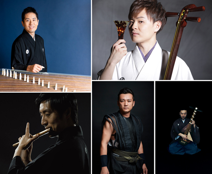(上段)中井智弥(箏・二十五絃箏)、浅野祥(津軽三味線)、 (下段)藤舎推峰(笛)、山部泰嗣(太鼓)、友吉鶴心(琵琶)