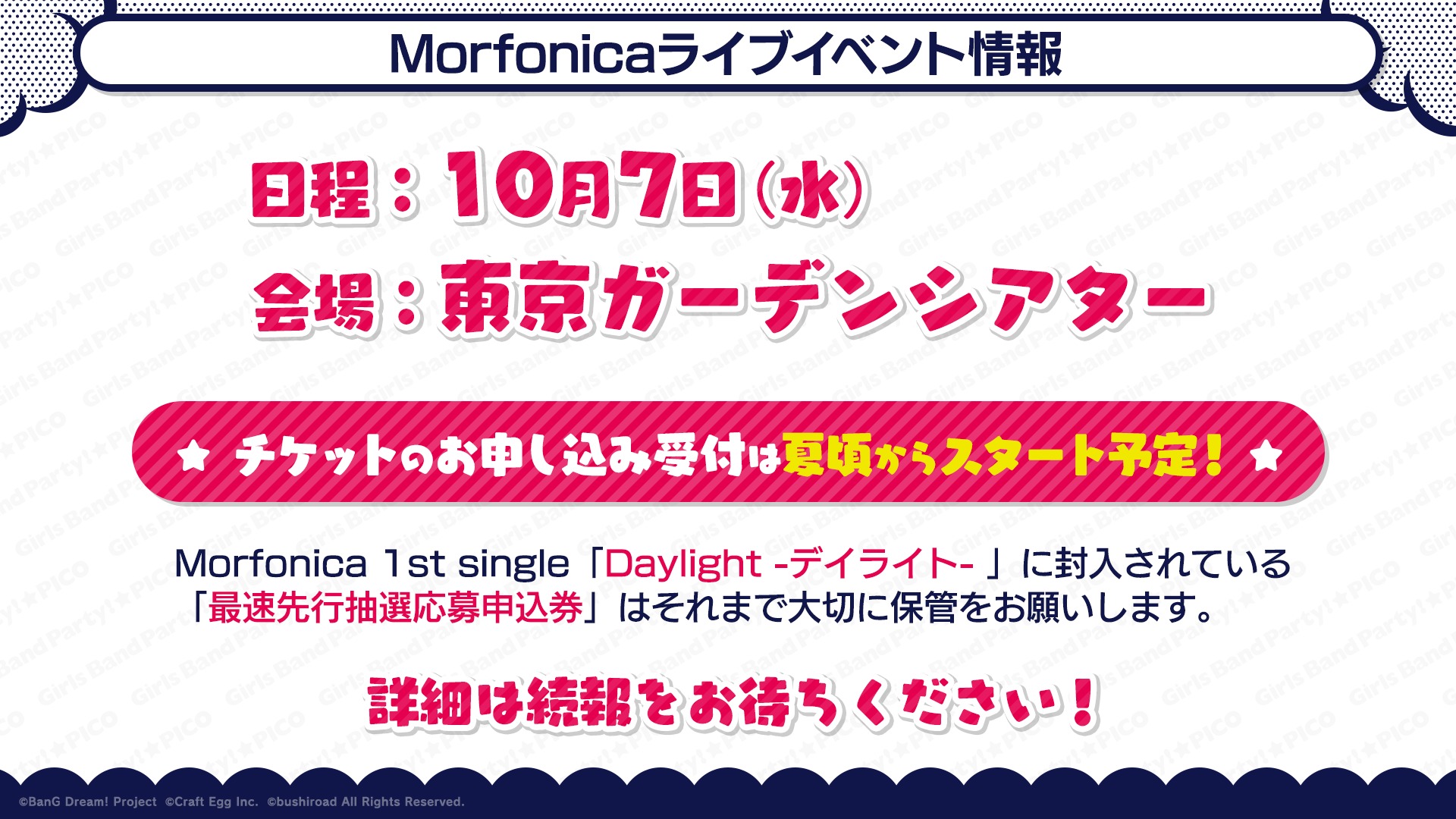 さらに、Morfonicaのライブイベントが10月7日(水)東京ガーデンシアターで開催されることが決定した。申込み受付は夏頃を予定しているとのことで、詳細については続報を待ちたい。