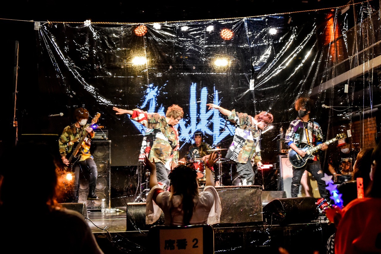 ステージとフロアの間にあるビニールシート越しに「いろんなリスクがある中、集まってくれてありがとう!」と感謝の気持ちを述べるhaderu(Vo)も、「いつもと違う状況だけど、みんなの目がキラキラしていて……。胸にこみ上げるものがあります」と感慨深げに言葉を紡ぐ。振りが楽しい「Packya Ma Lad」や、戻りガツオをいつものようにヌイグルミではなくイラストで表現した「Reverse Bonito」など、全10曲、1時間あまりという短いライブだったが、これからのライブのあり方の新しい試みとしても有意義なライブとなった。