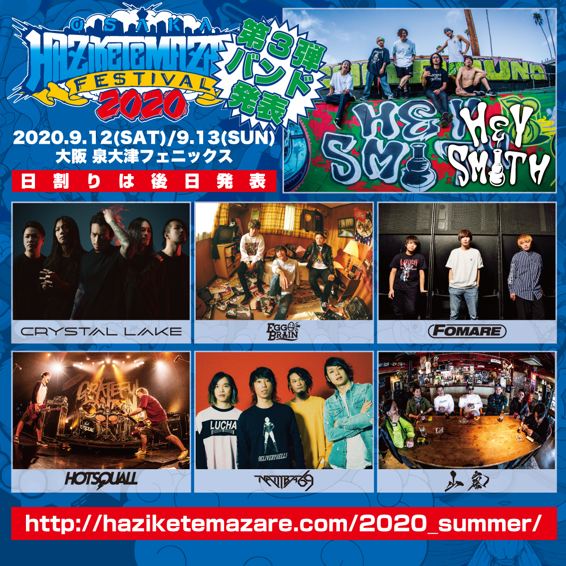 9月12日(土)、13日(日)の2日間、大阪・泉大津フェニックスにて開催される『HEY-SMITH Presents OSAKA HAZIKETEMAZARE FESTIVAL 2020』の第3弾出演アーティストが発表された。
