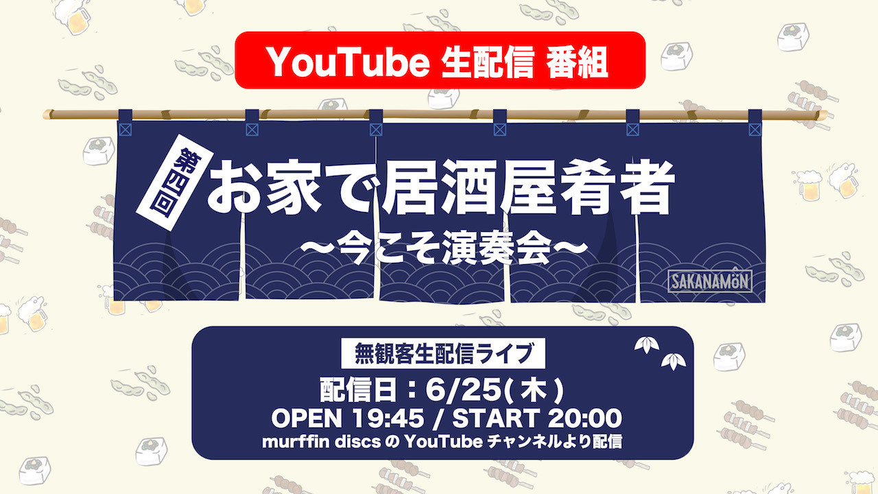 SAKANAMONが6月25日(木) 20時よりmurffin discsのYouTubeチャンネルにて「お家で居酒屋肴者」のスペシャル企画として生配信ライブ『お家で居酒屋肴者~今こそ演奏会~』の配信が決定した。