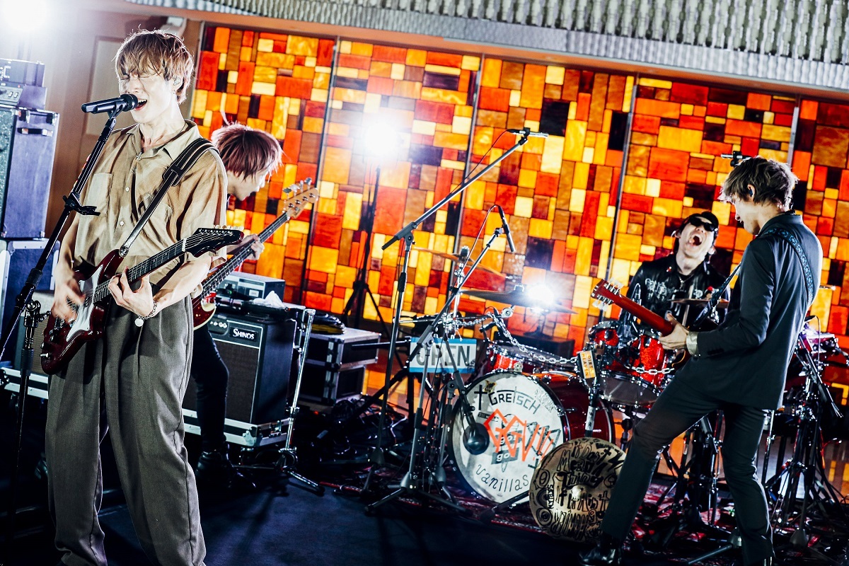 ギターでコードを鳴らしたあと、すうっと息を吸ってから唄い始めた牧 達弥(Vo/Gt)。そこに長谷川プリティ敬祐(Ba)、ジェットセイヤ(Dr)、柳沢 進太郎(Gt)のコーラスが重なっていく。そうして始まった1曲目は「おはようカルチャー」。セイヤのカウント、「今日は日頃溜まった鬱憤をみんなで叫ぼうぜー!」という牧の言葉を経てイントロに入った。ライブをやるのは約4ヶ月ぶりというバニラズ。4人の前に当然観客はいないが、それでもメンバー同士で音を合わせられるのが楽しくてしょうがないのか、目を見れずとも観客に伝えたいことが溢れるほどにあるからなのか、普段に匹敵する熱量で演奏していることが伝わってくる。コール&レスポンスやシンガロングの煽りも全力。カメラに目線を向けたメンバーは、画面の向こう側のあなたに語りかけている。これまでたくさんライブで演奏されてきた「おはようカルチャー」は、メンバーだけでなく、観客も歌声を重ねる曲。メンバーと観客は今同じ場所にいないが、一人ひとりが自分の場所から声を上げれば、それはやがて大きな生命力になる。そんなことを信じながら、牧は変わらず「みんなの声を聞かせて!」と投げかける。