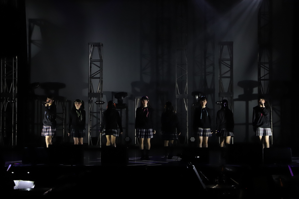 そして、「あなたにとってDIALOGUE+とは?」という問いかけに答えるメンバーのインタビュー映像とバンドソロ演奏が終わると、いよいよライブも後半へ。ここで、メンバーモチーフのピクトグラムがプリントされた黒のワンピース姿の新衣装で登場した8人は、「ダイアローグ+インビテーション!」からラストスパートをかけ、「大冒険をよろしく」「ぼくらは素敵だ」を続けて3曲歌うと、最後に「ぼくたちのかくめい!」と叫び拳を振り上げた。