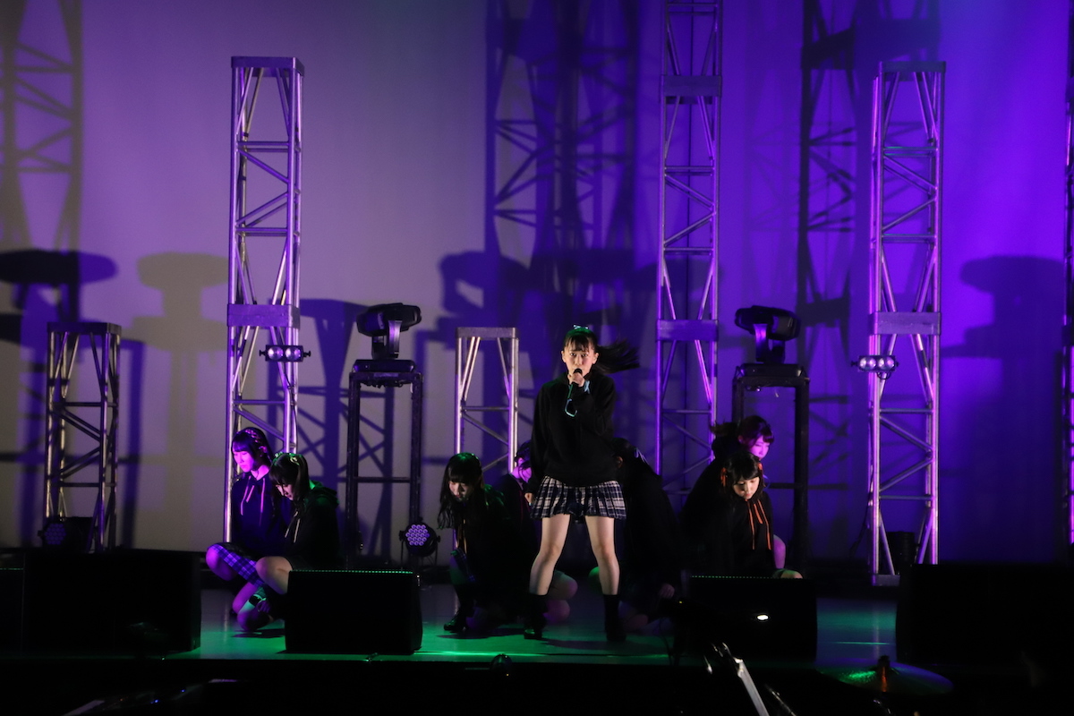 暗闇の中から、黒いパーカーに着替えたメンバーが登場すると、ダンサブルナンバー「Domestic Force!!」のイントロが。ここまでの、華やかでかわいらしい振り付けやライティングから一変し、さながらダンスユニットのような激しい動きとともに力強い歌声が響き渡る。