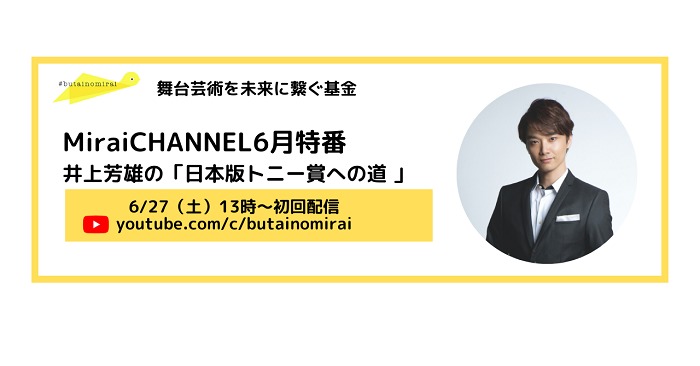 コロナ禍で困窮している舞台芸術関係者を支援するために設立された「舞台芸術を未来に繋ぐ基金(以下みらい基金)」が、2020年6月27日(土)に、みらい基金のYouTubeチャンネル「Mirai CHANNEL」において、井上芳雄をナビゲーターに迎え、特別番組を放送する。「日本版トニー賞への道」と題し、舞台芸術にまつわる賞に関する検証・討論番組を放映する予定となっている。